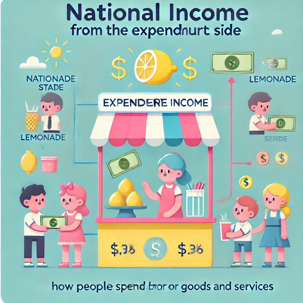 예시: 사람들이 친구들이 만든 레모네이드를 사기 위해 지불한 돈을 생각해 보세요. 이 모든 돈을 합친 것이 지출 측면에서의 국민소득이에요. 사람들이 레모네이드를 많이 사면 지출도 늘어나고, 그만큼 국민소득도 증가하는 거예요.