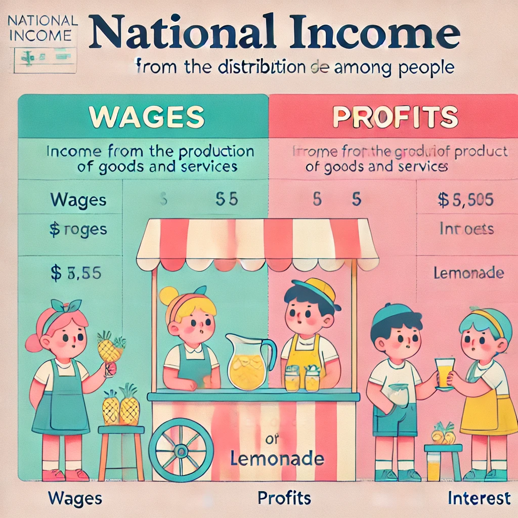 예시: 만약 친구들이 모두 각자 레모네이드를 만들고 판다고 생각해 보세요. 친구들이 만든 모든 레모네이드를 다 합친 것이 생산 측면에서의 국민소득이에요. 레모네이드를 많이 만들고 팔수록 국민소득도 높아지는 거예요.