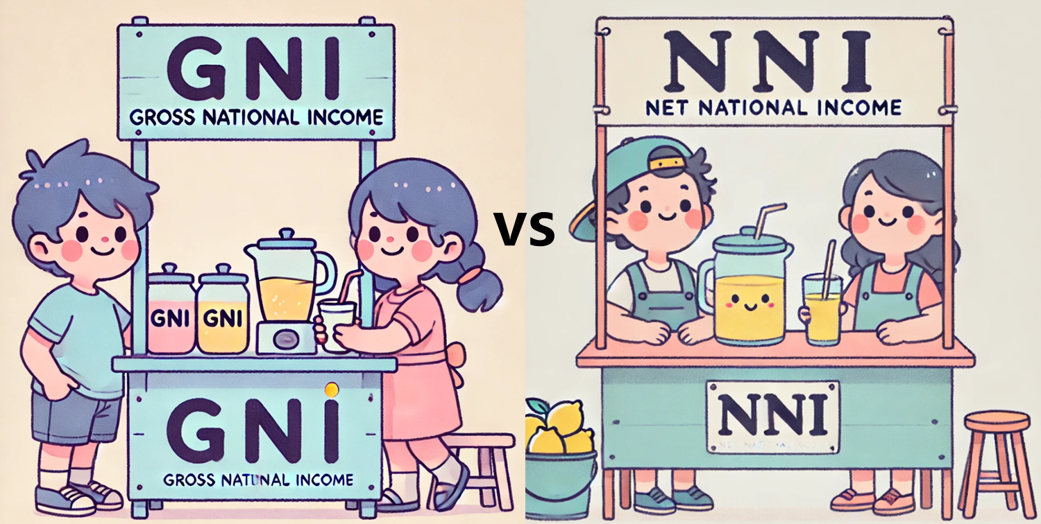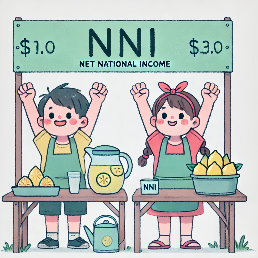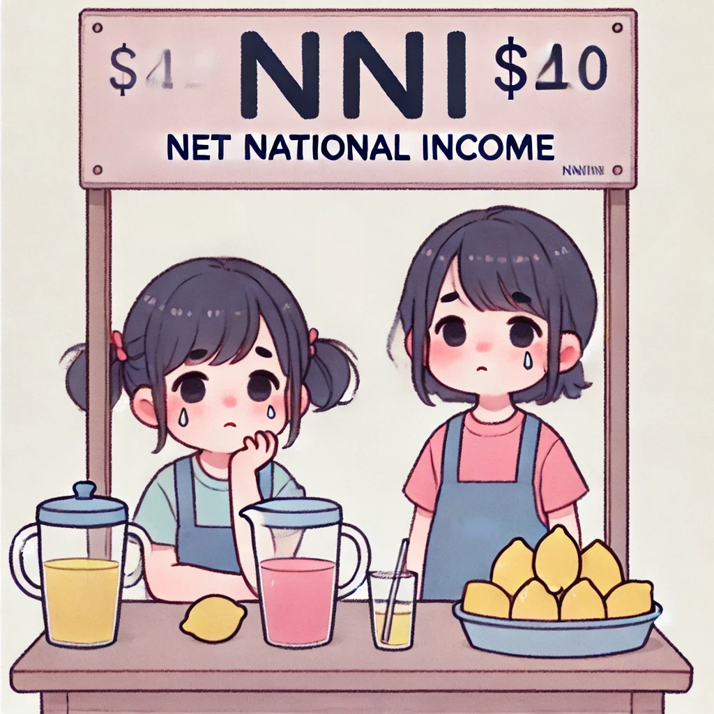 예시: 만약 친구들이 레모네이드를 팔아서 번 돈이 100만 원이라고 해요. 하지만 레모네이드를 만드는 기계가 오래되면서 그 기계의 가치가 10만 원 줄어들었다면, 친구들이 실제로 사용할 수 있는 돈은 90만 원이에요. 이 90만 원이 바로 국민순소득(NNI)이에요.